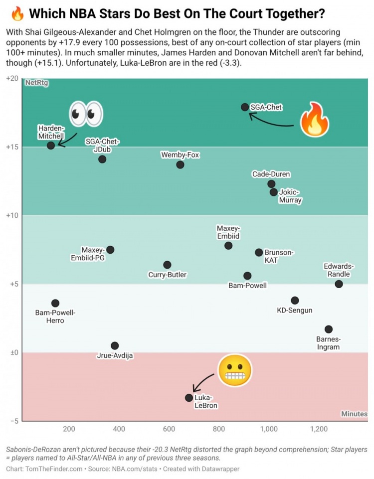 3月4日讯 近日,数据专家Tom Haberstroh晒图总结了本赛季联盟中同场最能赢分的球星双人组。在同时出场至少100分钟下的球星搭档中,亚历山大和霍姆格伦每百回合净胜17.9分最多。哈登和米切尔同场的时间样本小得多,但每百回合能净胜15.1分。而东契奇和詹姆斯同场时每百回合净负3.3分。在今日湖人击败鹈鹕的比赛过后,该专家补充道:“在昨晚对阵鹈鹕的比赛...