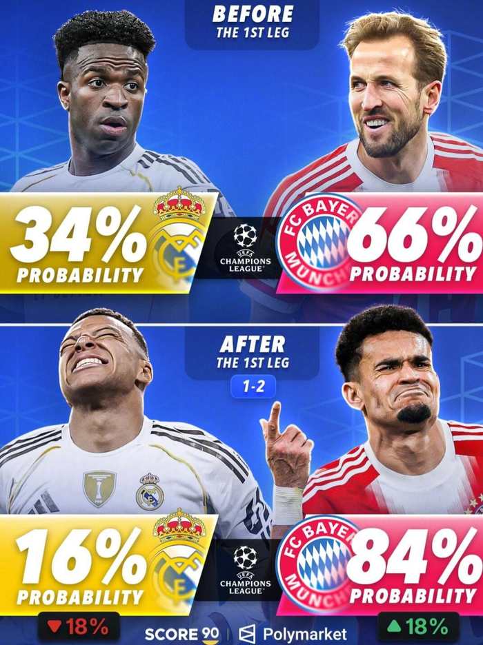 #欧冠[超话]# 欧冠淘汰赛首回合战罢,相关预测平台也更新了各队的晋级概率。根据Score90援引Polymarket给出的最新数据,拜仁和阿森纳都在首回合赢球后进一步占据晋级主动。在皇马与拜仁的对决中,拜仁首回合客场2比1取胜后,晋级半决赛的概率从赛前的66%上升至84%,提升了18个百分点;皇马则从34%下降至16%,次回合将面临更大压力。另一组对决中...